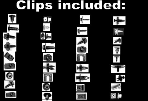 - Gripper system includes 1 box each (Quantity follows description): 6mm universal clip-100; 7mm push clip-50, 6x25mm body bolt/small washer-35; 6x25mm bodybolt/large washer-25; 6mm short fold clip-40; 6mm long fold clip-40, 6mm nut w/ spin washer-50; 8x30mm body bolt-30; 8mm long fold clip-30; GM grill clip-100; #8 chrome wheel open screw-100